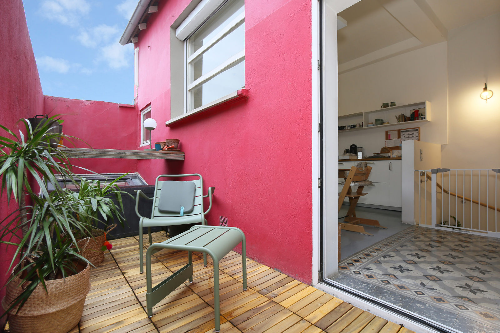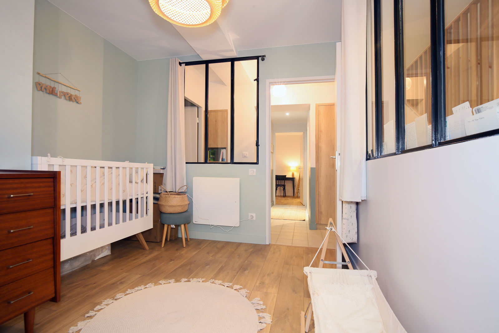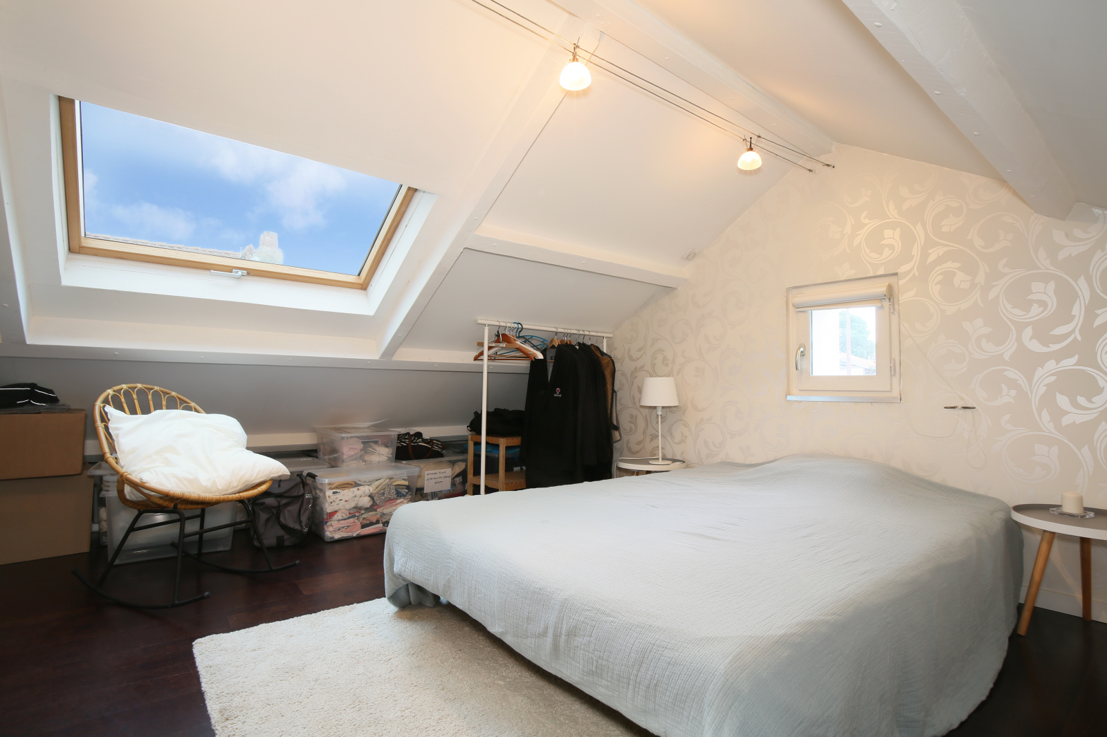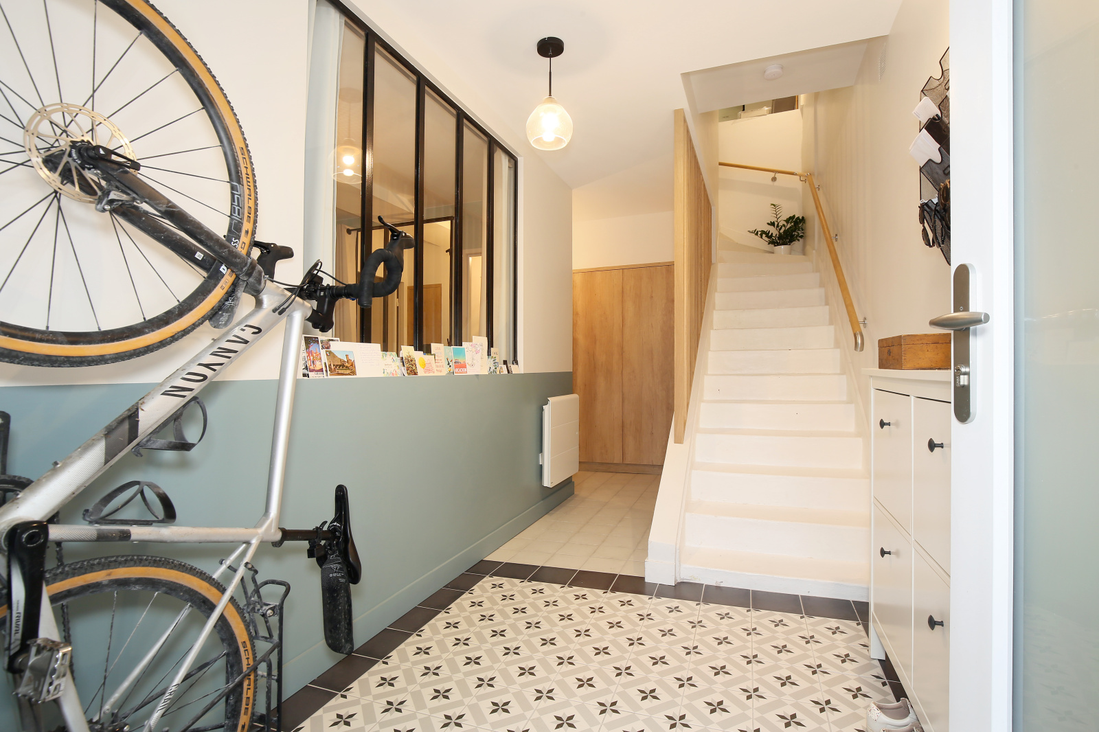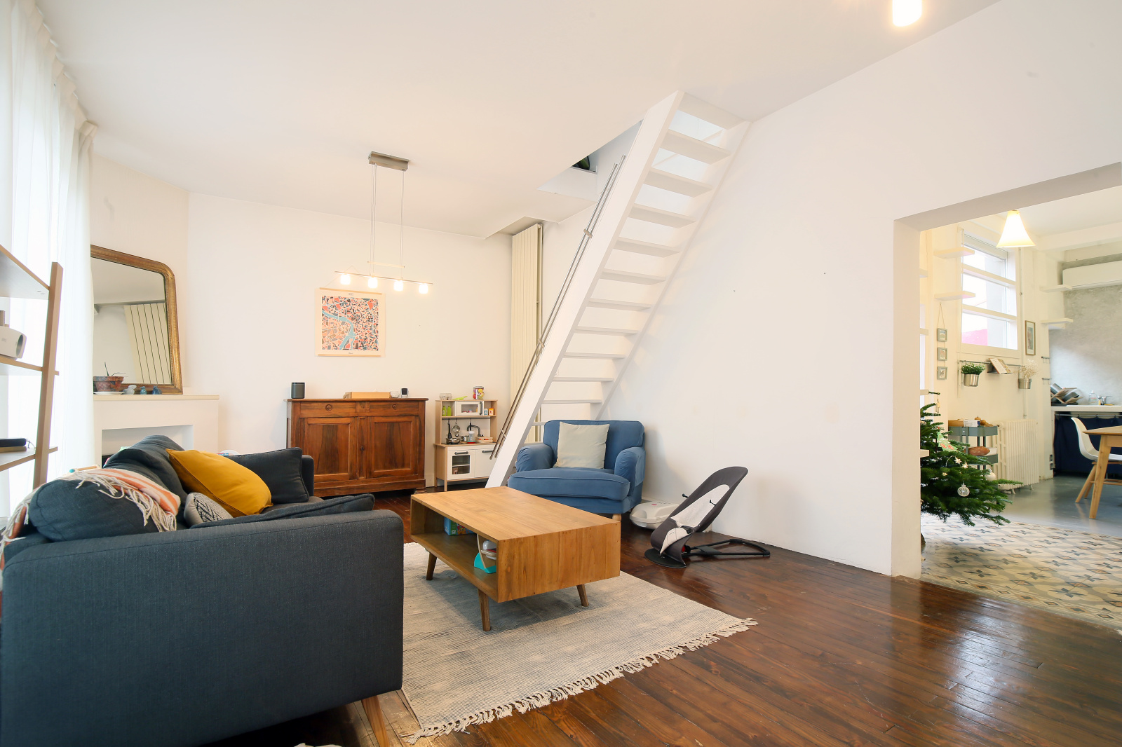 Les pièces de vie sont au 1er étage, l'escalier donne sur une vaste cuisine/ salle à manger agrémentée d'une terrasse/patio sans vis à vis et d'un séjour lumineux.