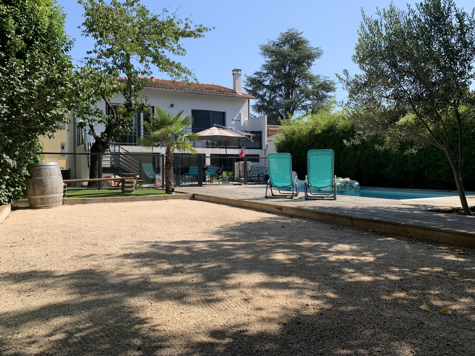 A l'extérieur, vous disposerez de places de parking sur le devant de la maison et sur l'arrière, d'un beau jardin arboré avec piscine, terrain de pétanque et terrasses sans vis à vis pour profitez des soirées entre amis.