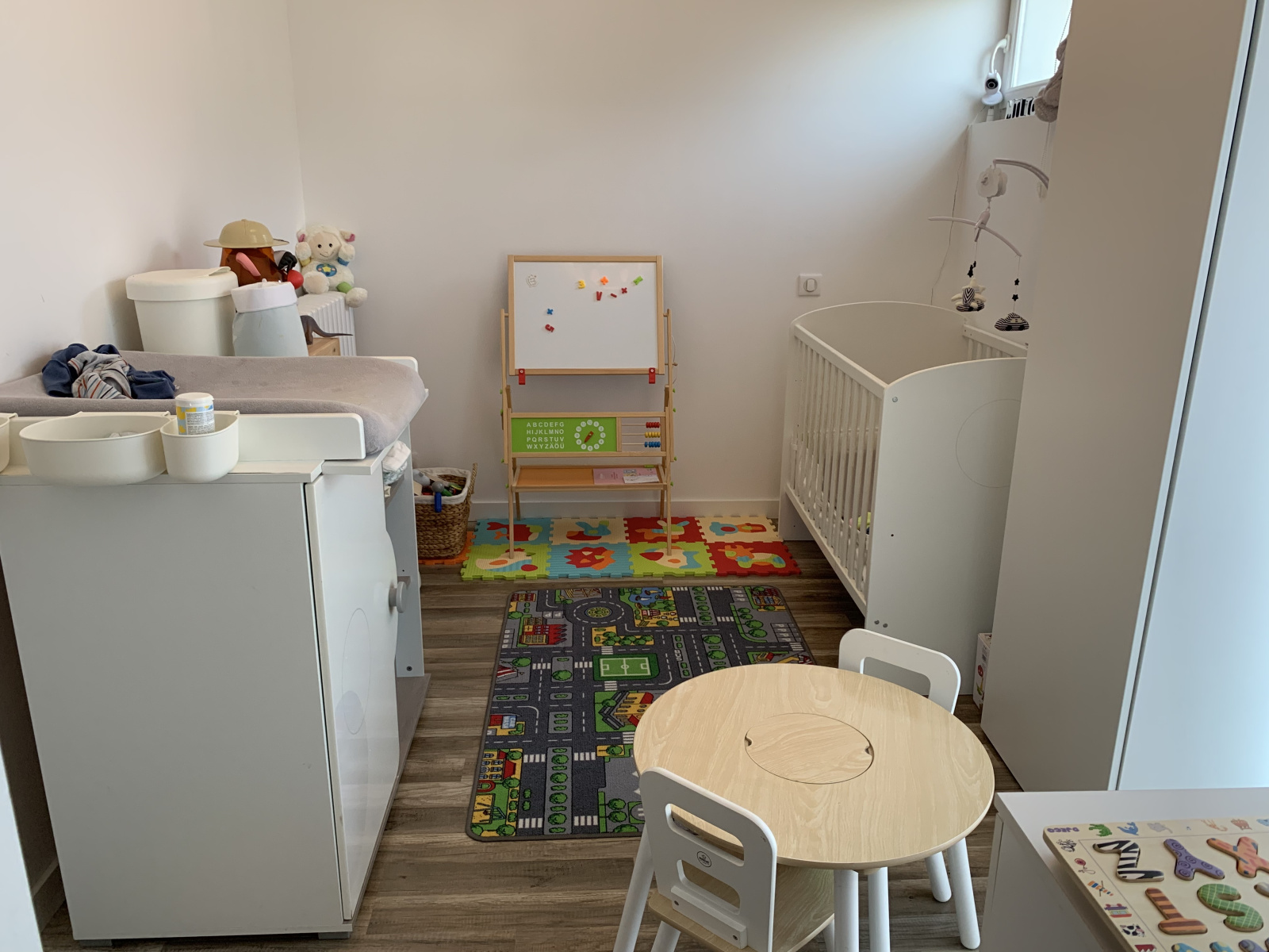 Au rez-de-chaussée, une entrée dessert deux chambres dont une avec dressing, une grande salle de bains, un bureau/atelier ouvert sur le jardin, un garage pour 2 roues, une chaufferie et un second wc.
